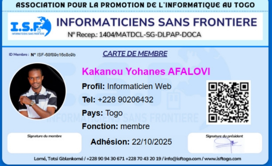Carte de membre numérique avec QR code, identité et date de validité.
